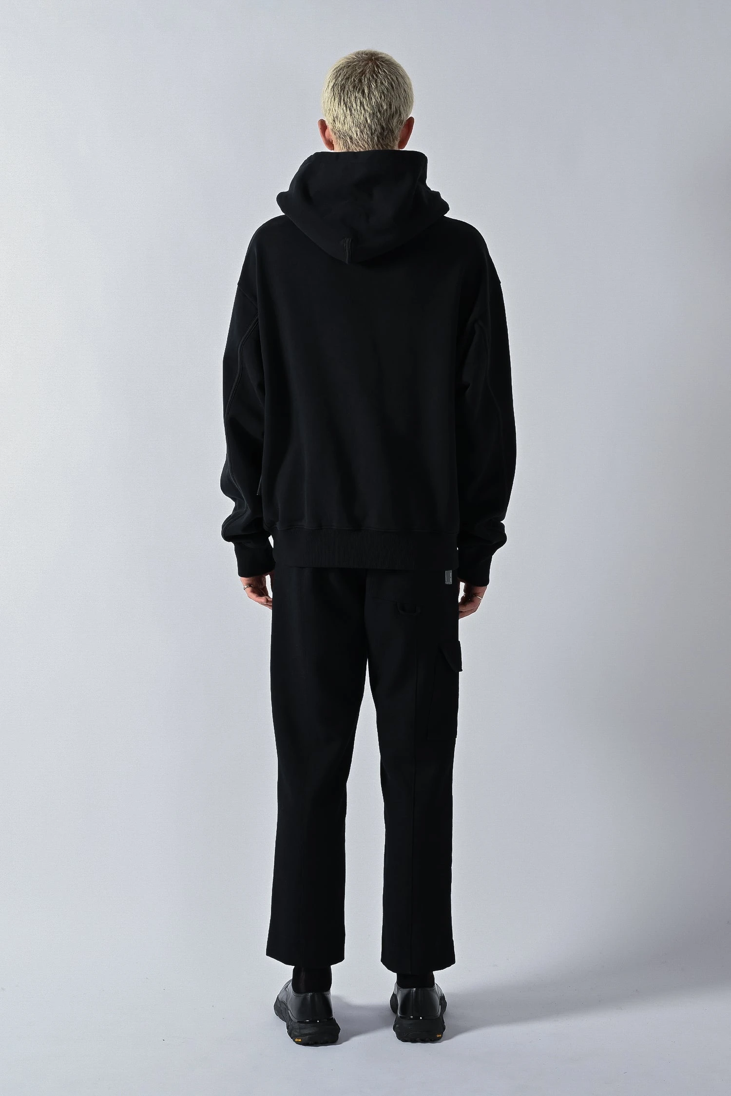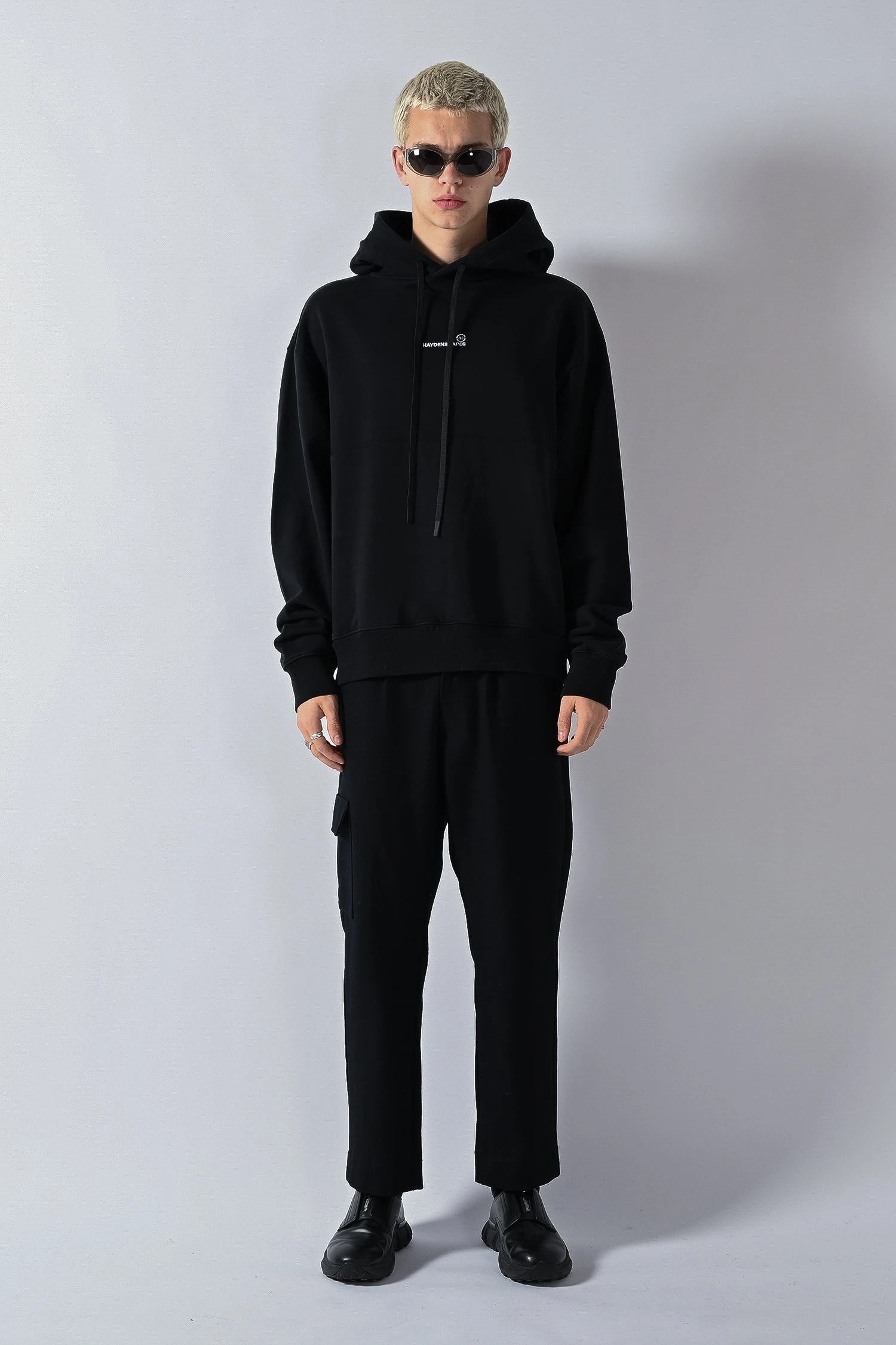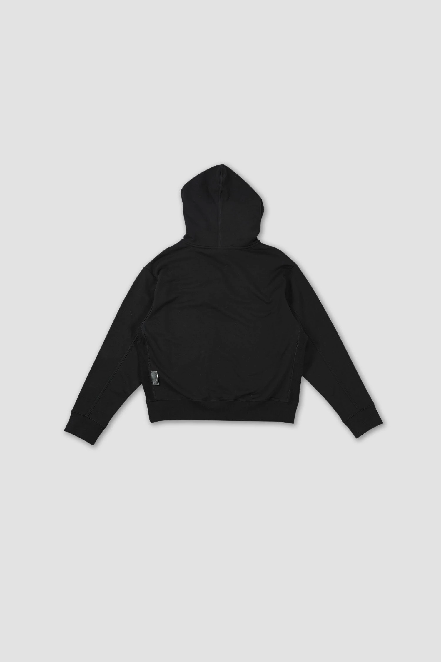 Made of a 400gsm semi brushed french terry cotton, the Basic Hood features a signature and contemporary box shape with drop shoulder silhouette, cover stitched inverted fabric side panels, a woven brand label with a PVC outer layer, silicon dipped drawcord, concealed side zip pockets and embroidered front logo.