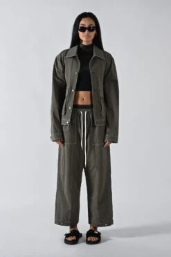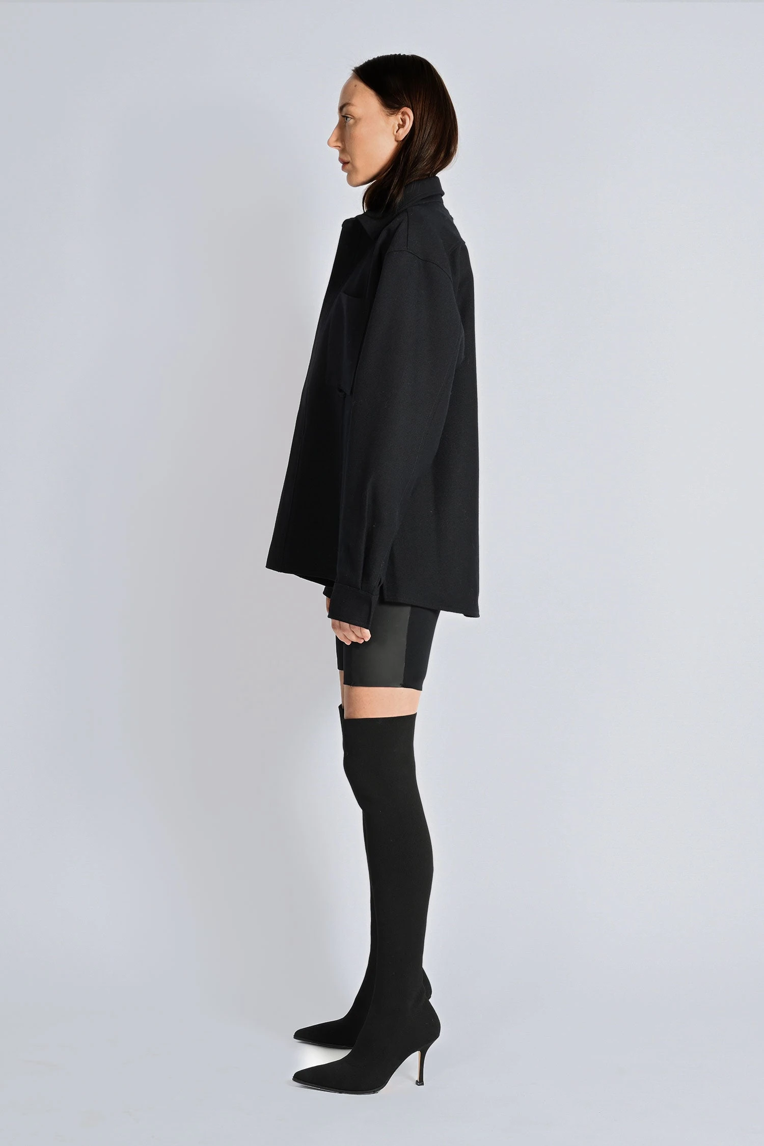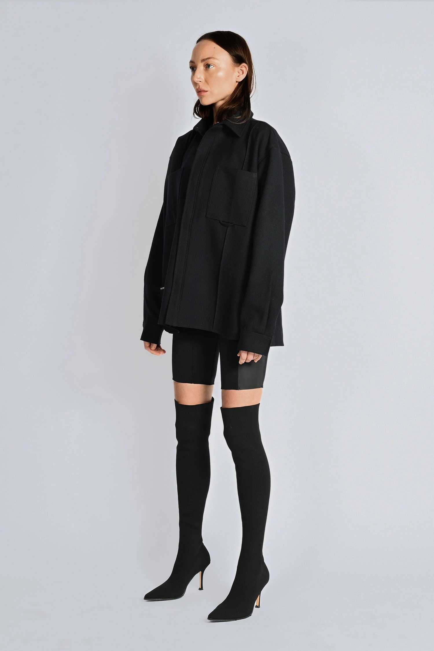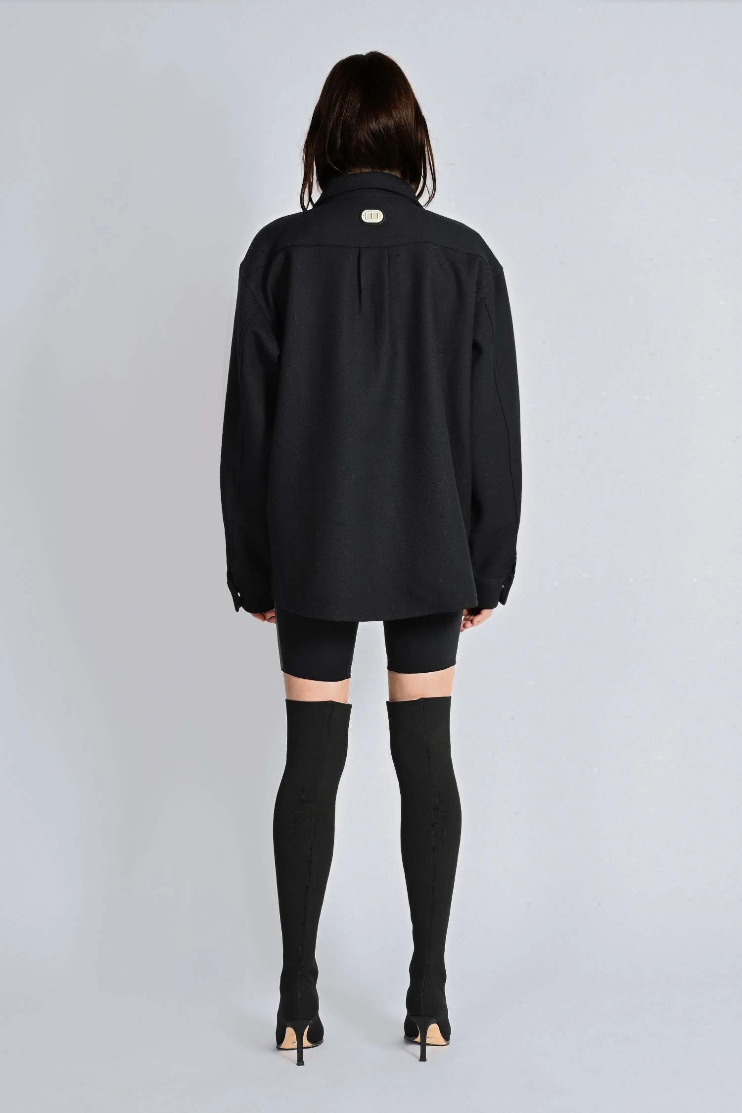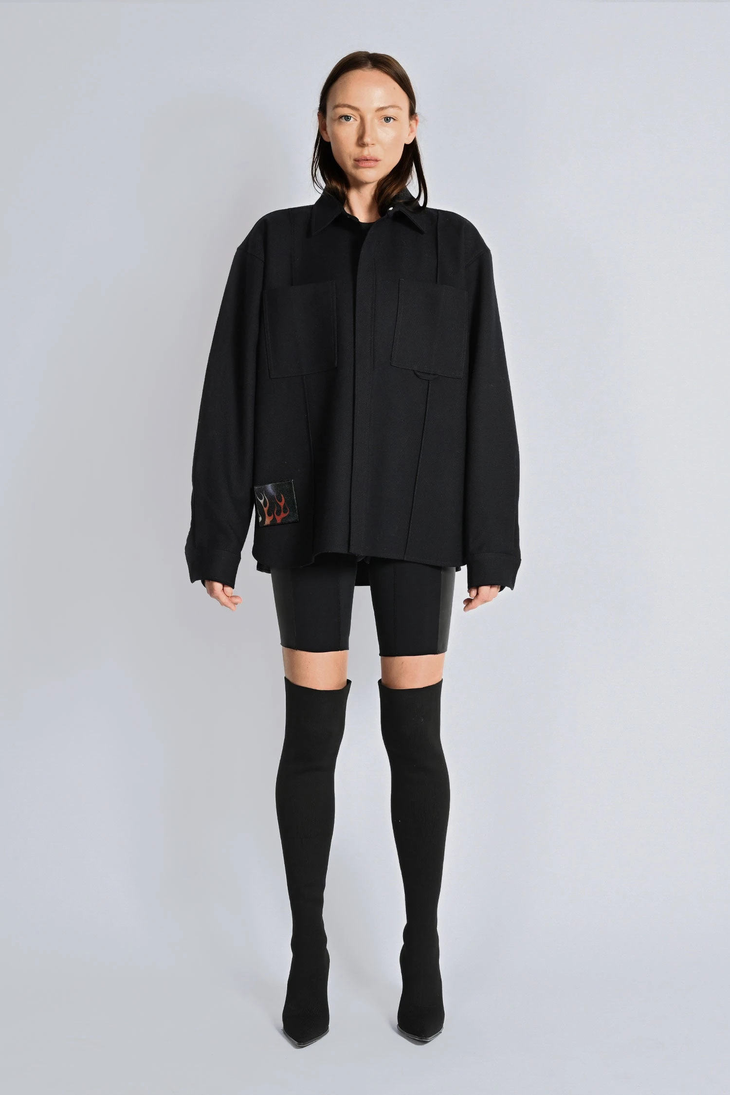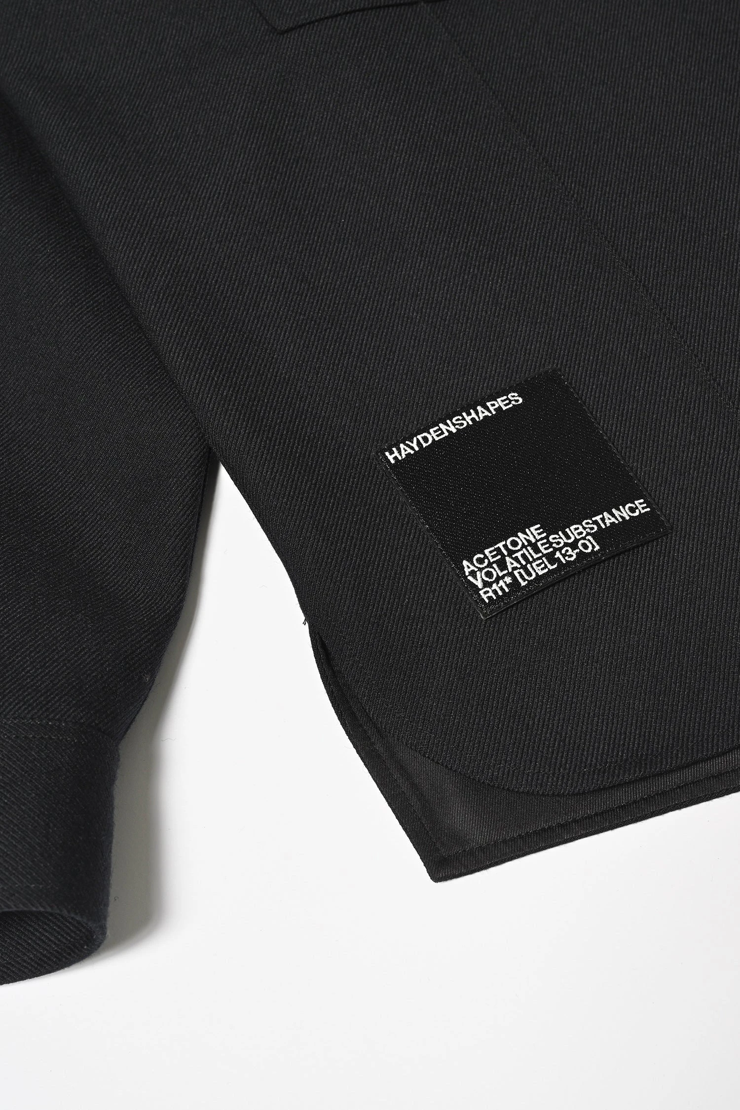 100% Australian Merino Wool, Woolmark certified. Over sized wool shirt with dropped shoulders and exagerated sleeves, large front patch pockets, metal summarys and logo hardware feature. The art is applied by an interchangable hook and loop patch that can be switched from a vibrant green seasonal graphic to a more stealth tonal Haydenshapes logo, to a ensure this investment piece remains current season after season – a new staple. Made in partnership with The Woolmark Company.