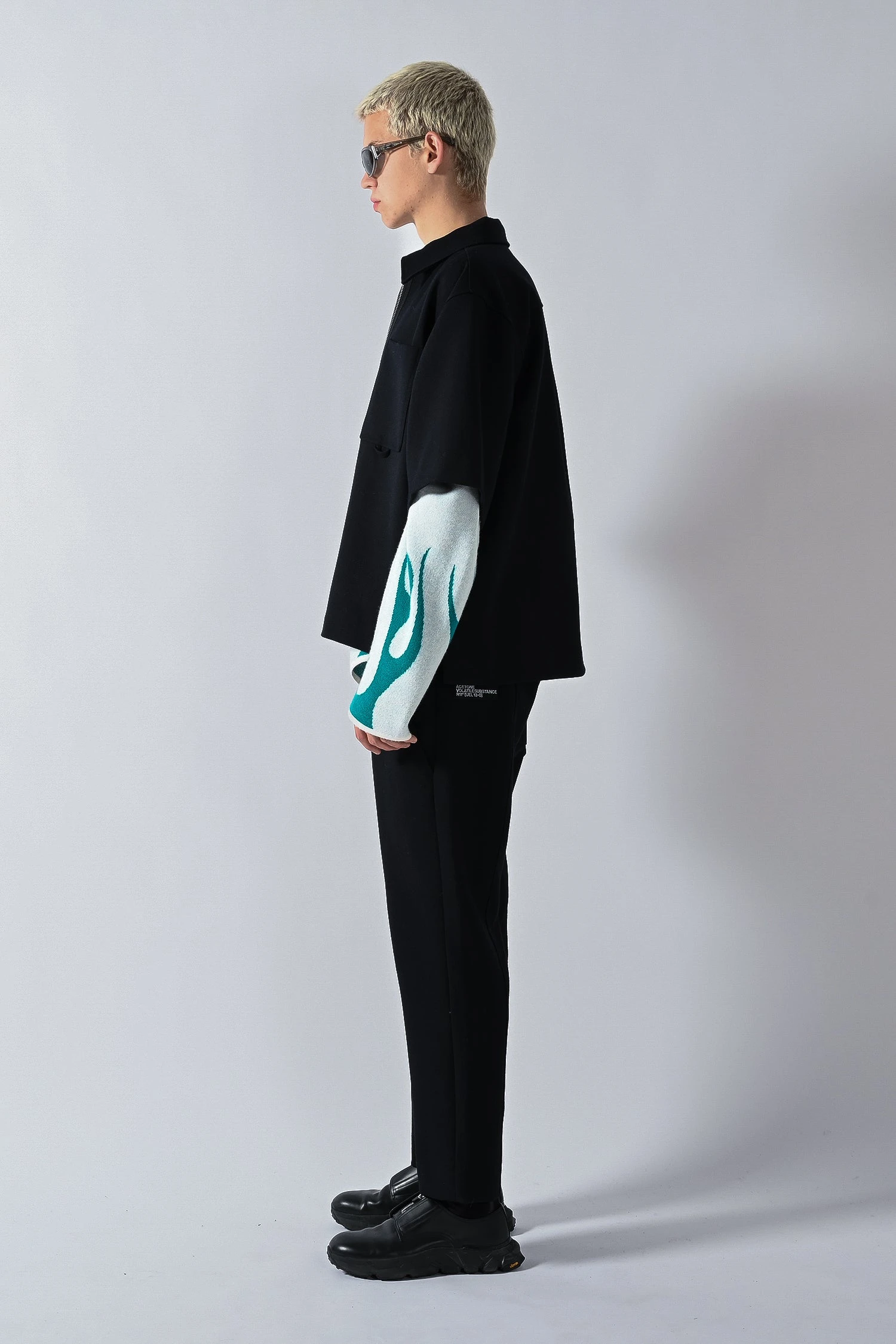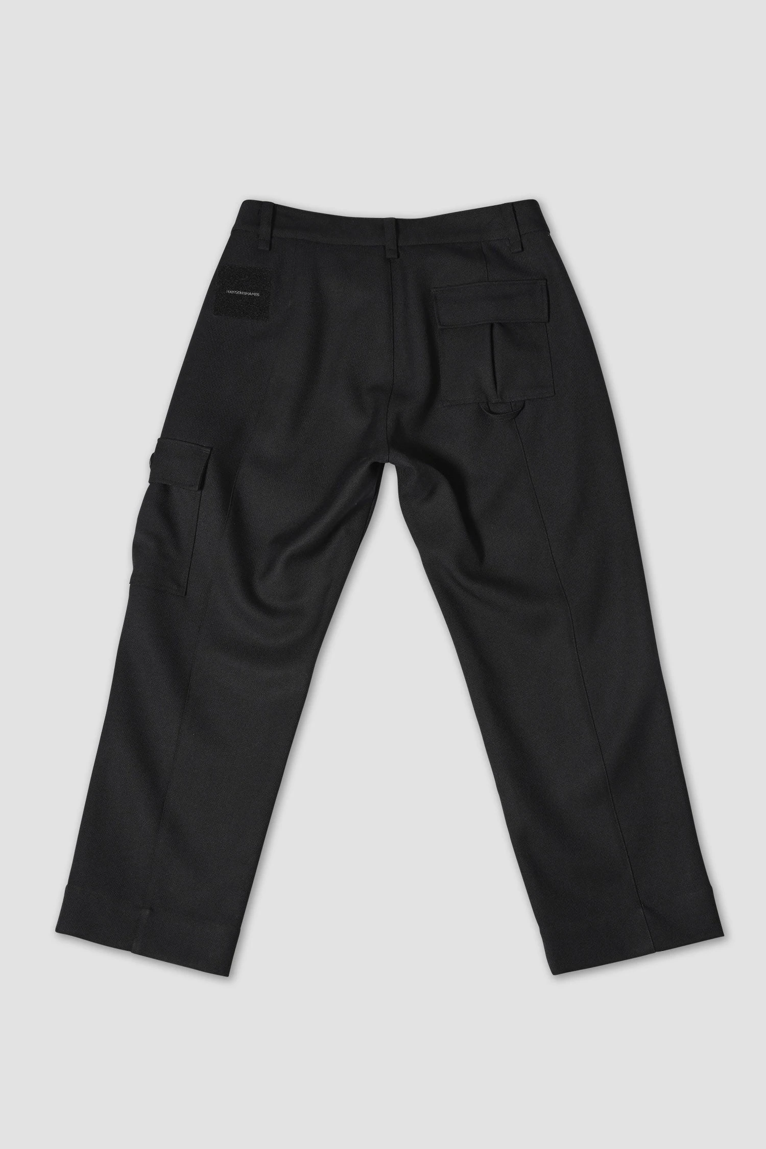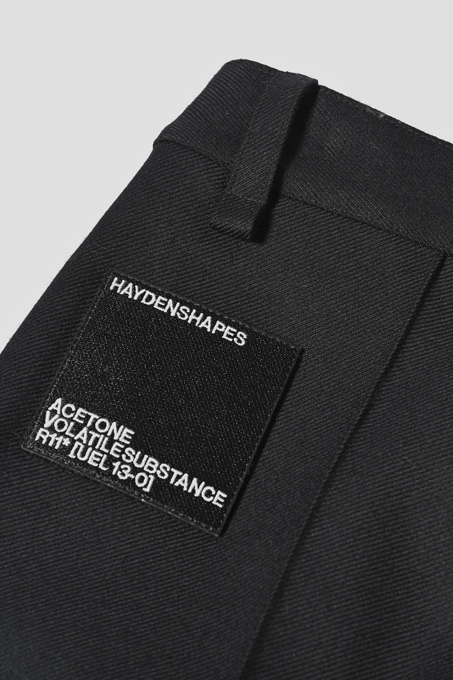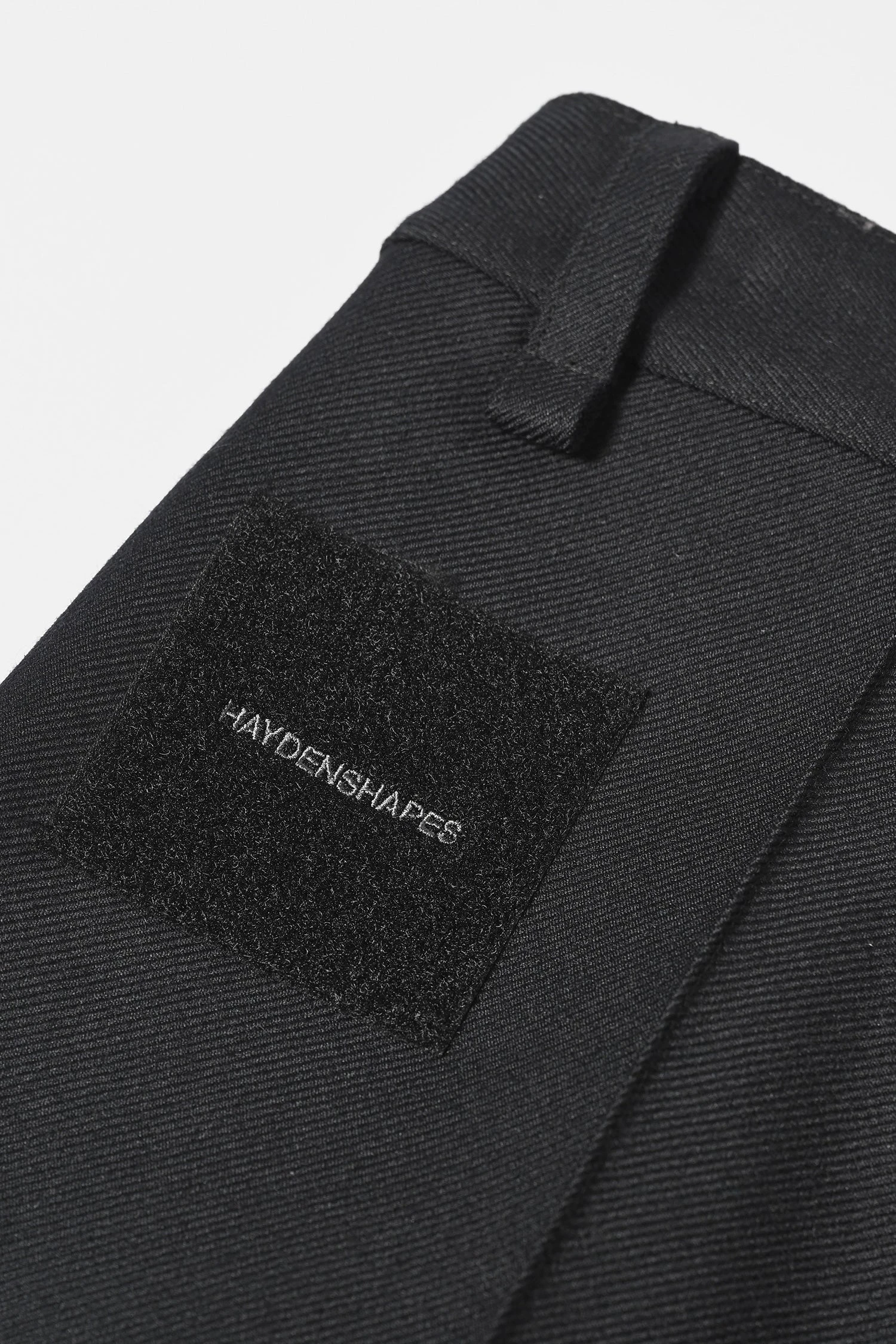 100% Australian Merino Wool, Woolmark certified. A relaxed wide leg pleated tailored suiting pant design with a large cargo pocket, made from structured Hainsworth Wool in partnership with The Woolmark Company. The art is applied by an interchangable hook and loop patch that can be switched from a vibrant green seasonal graphic to a more stealth tonal Haydenshapes logo, to a ensure this investment piece remains current season after season – a new staple. The highend custom summary is created from upcycled surfboard resin and merino wool off cuts.