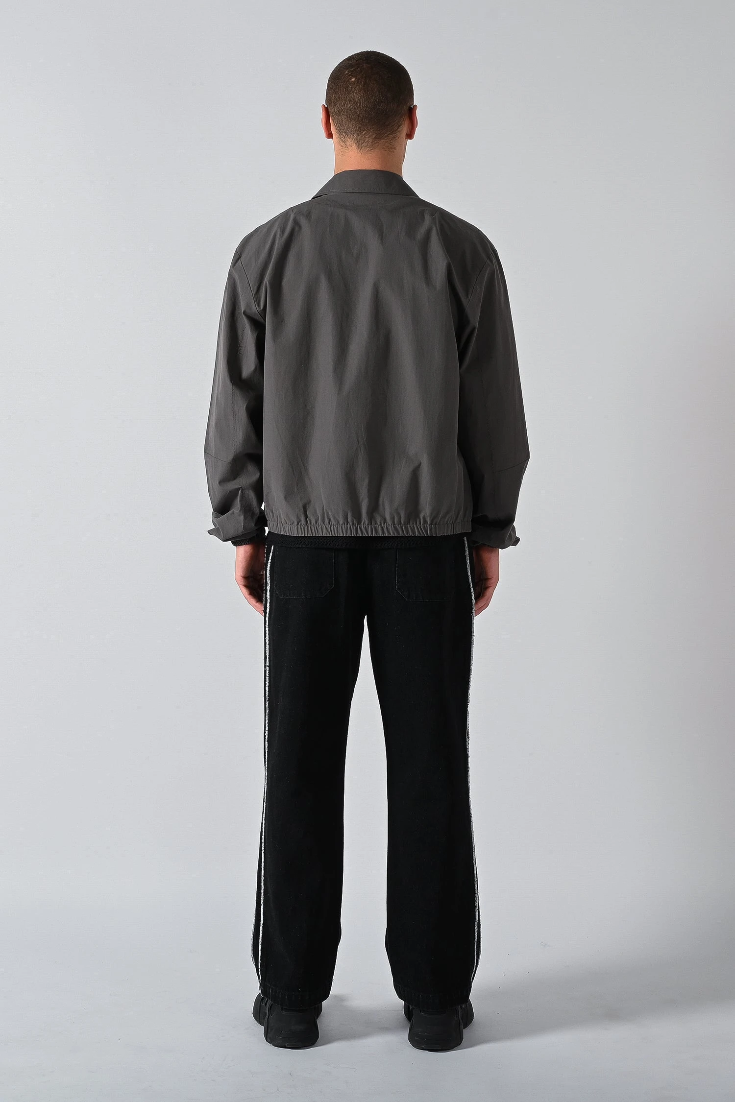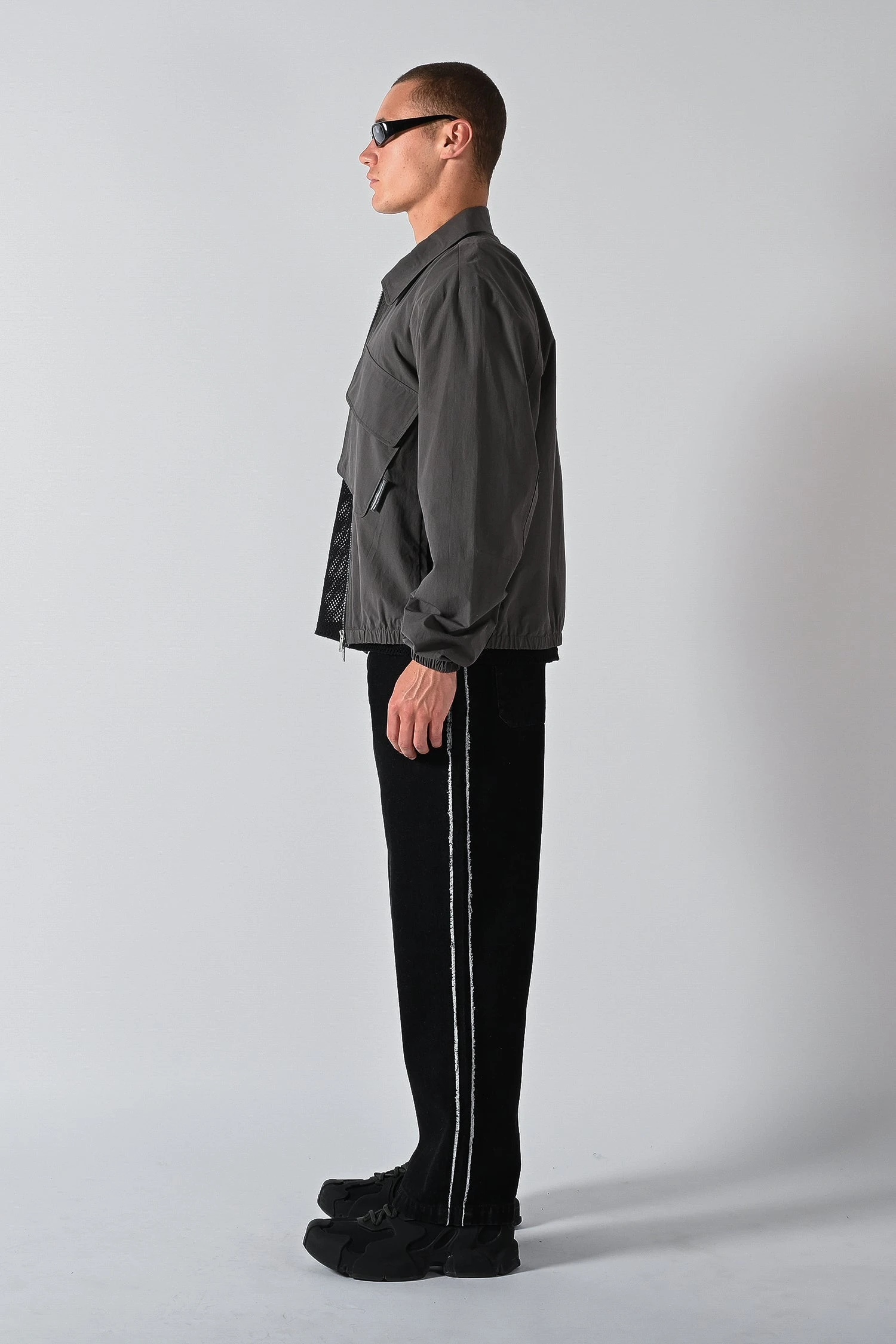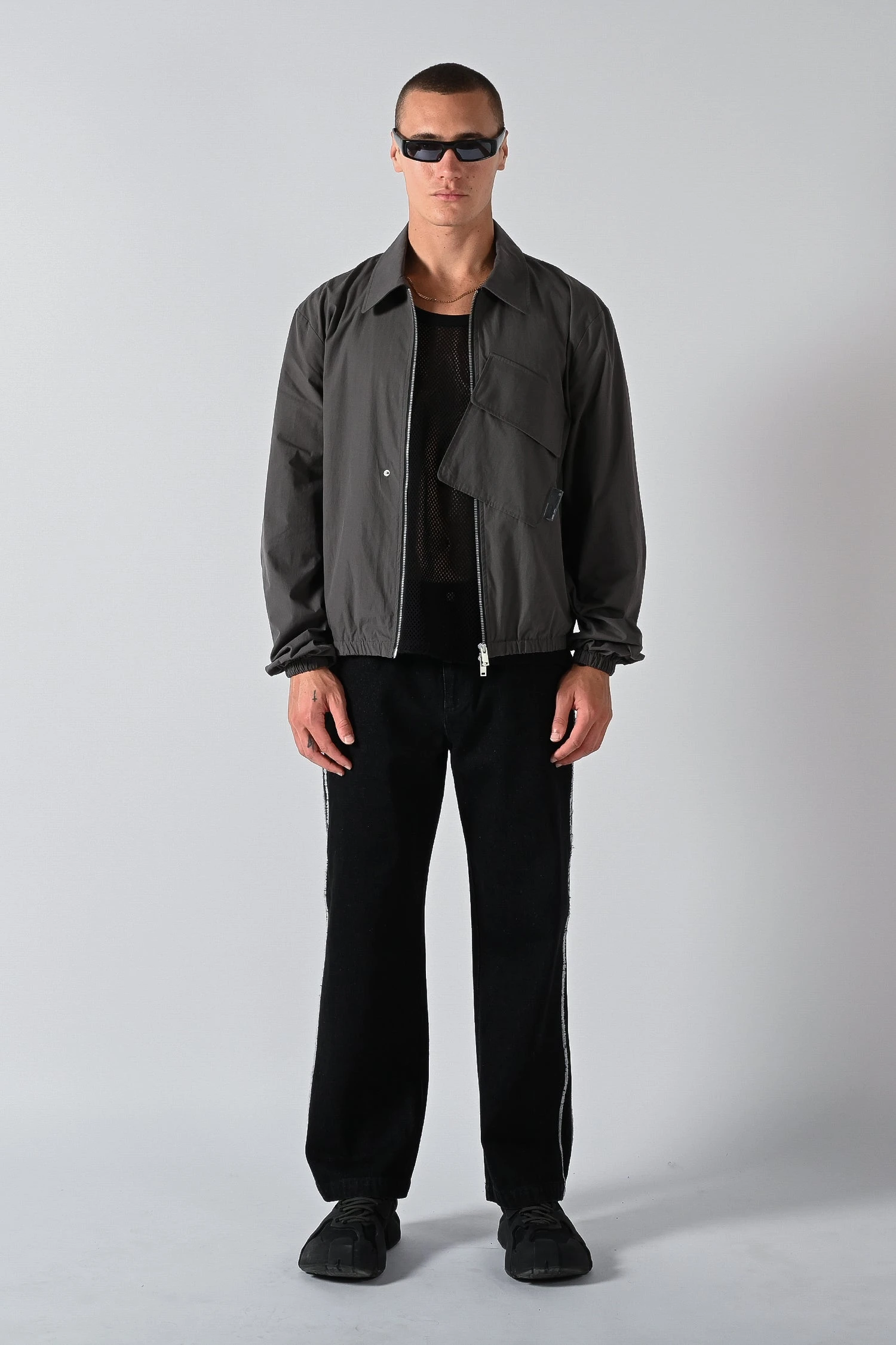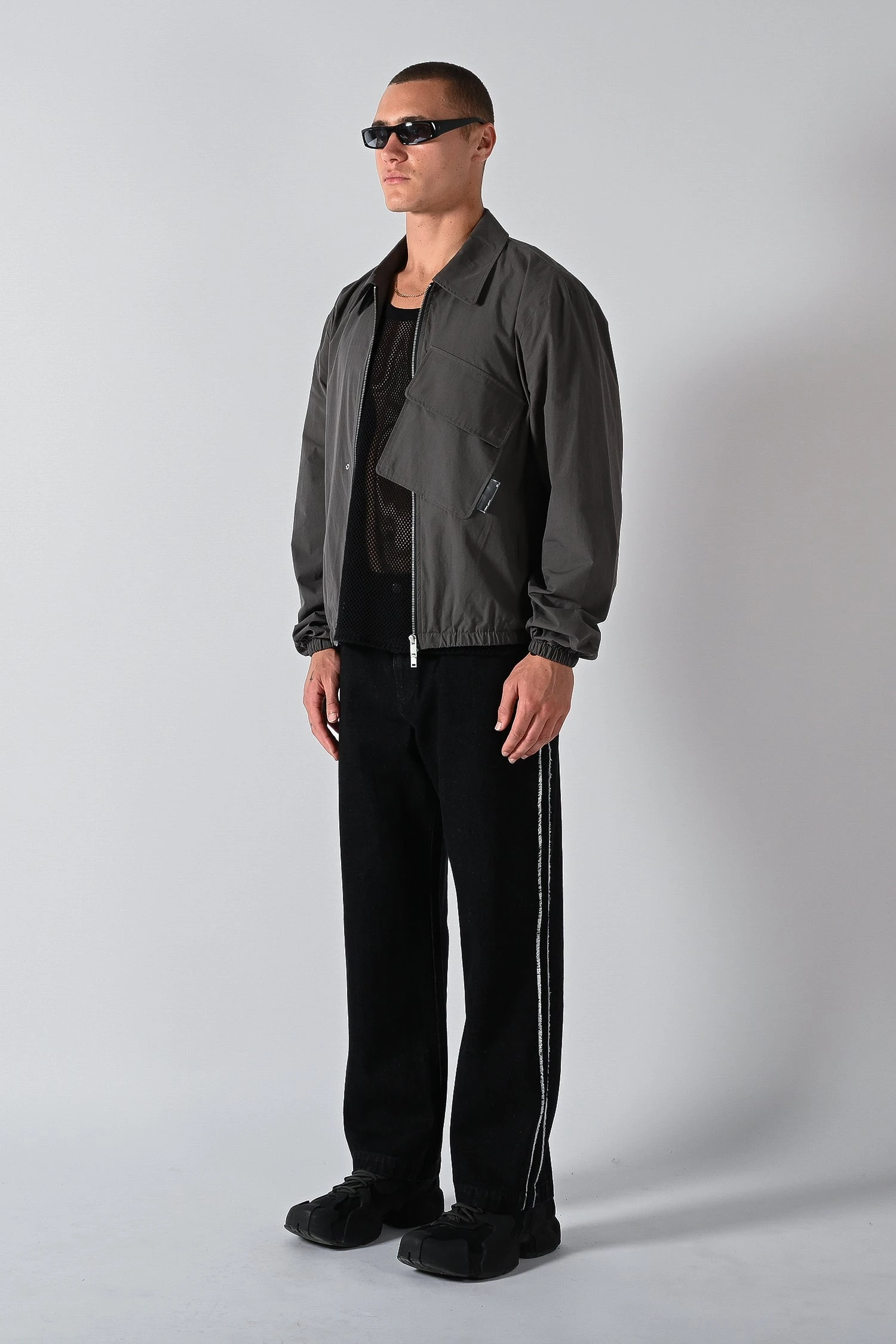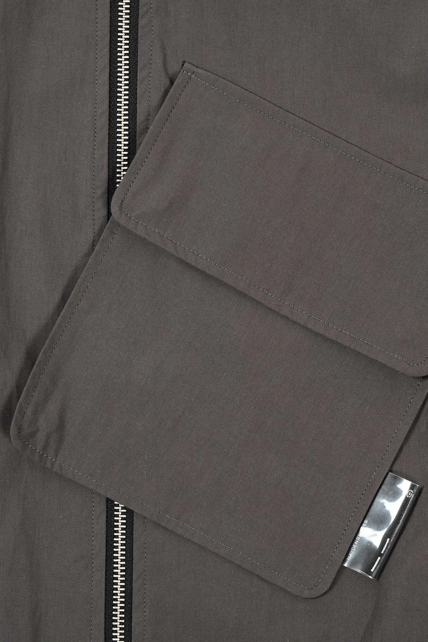 Made from peached poly nylon fabric with a boxy silhouette and drop shoulder design. The Offset Shell Jacket features an oversized front pockets that sits offset across the front centre zip entry. Available in two colours, Tarmac and Mirage.Â