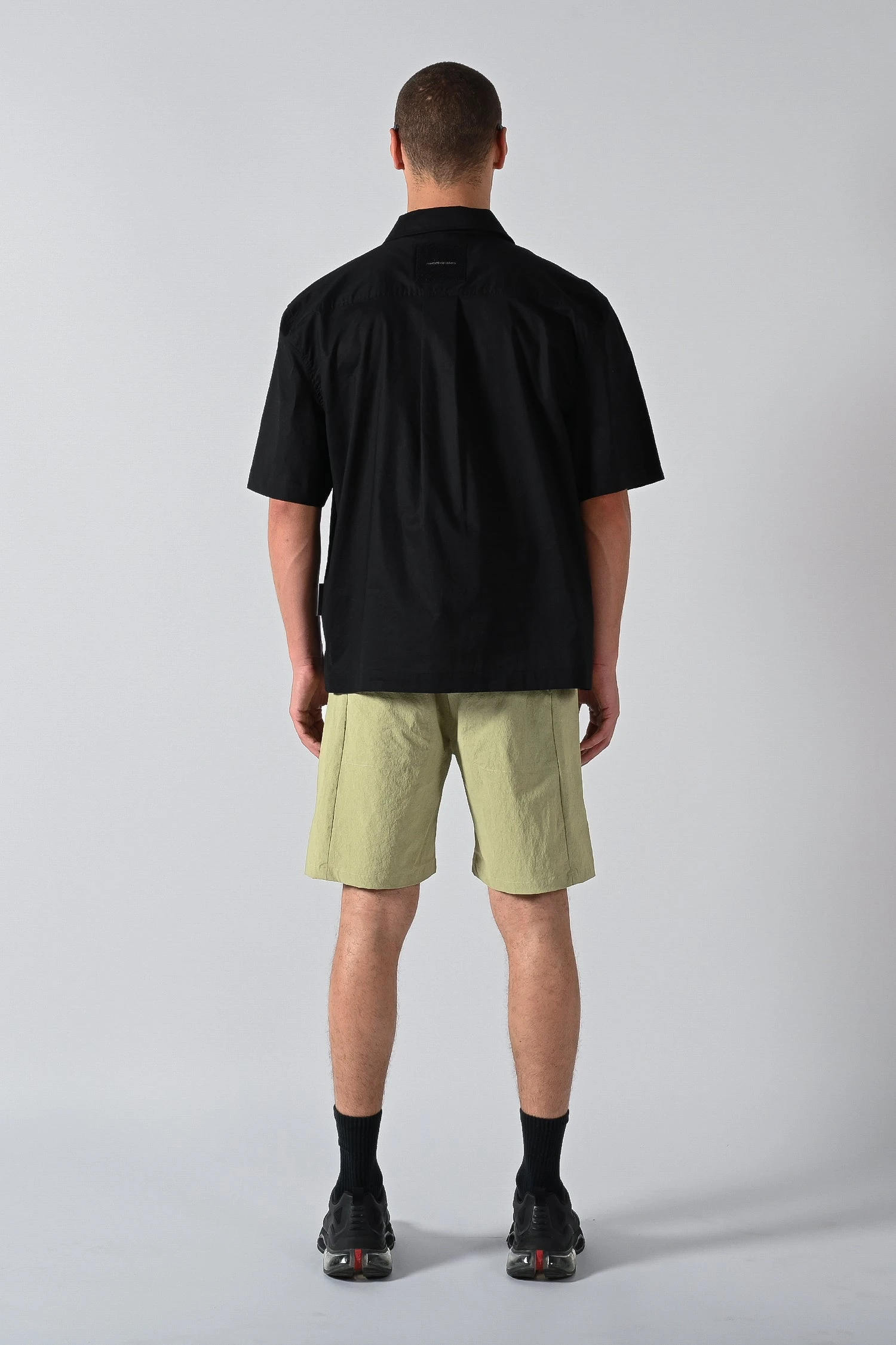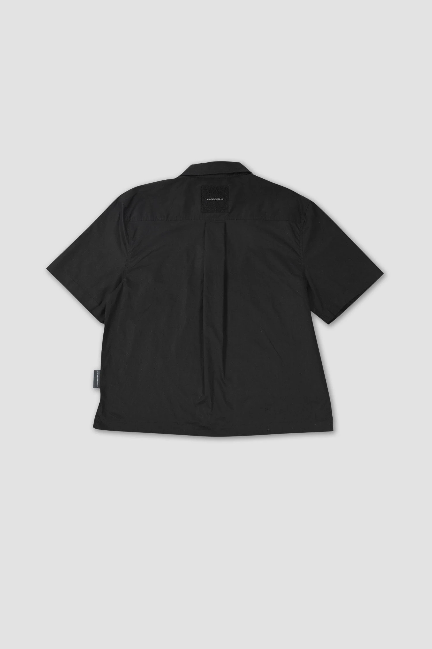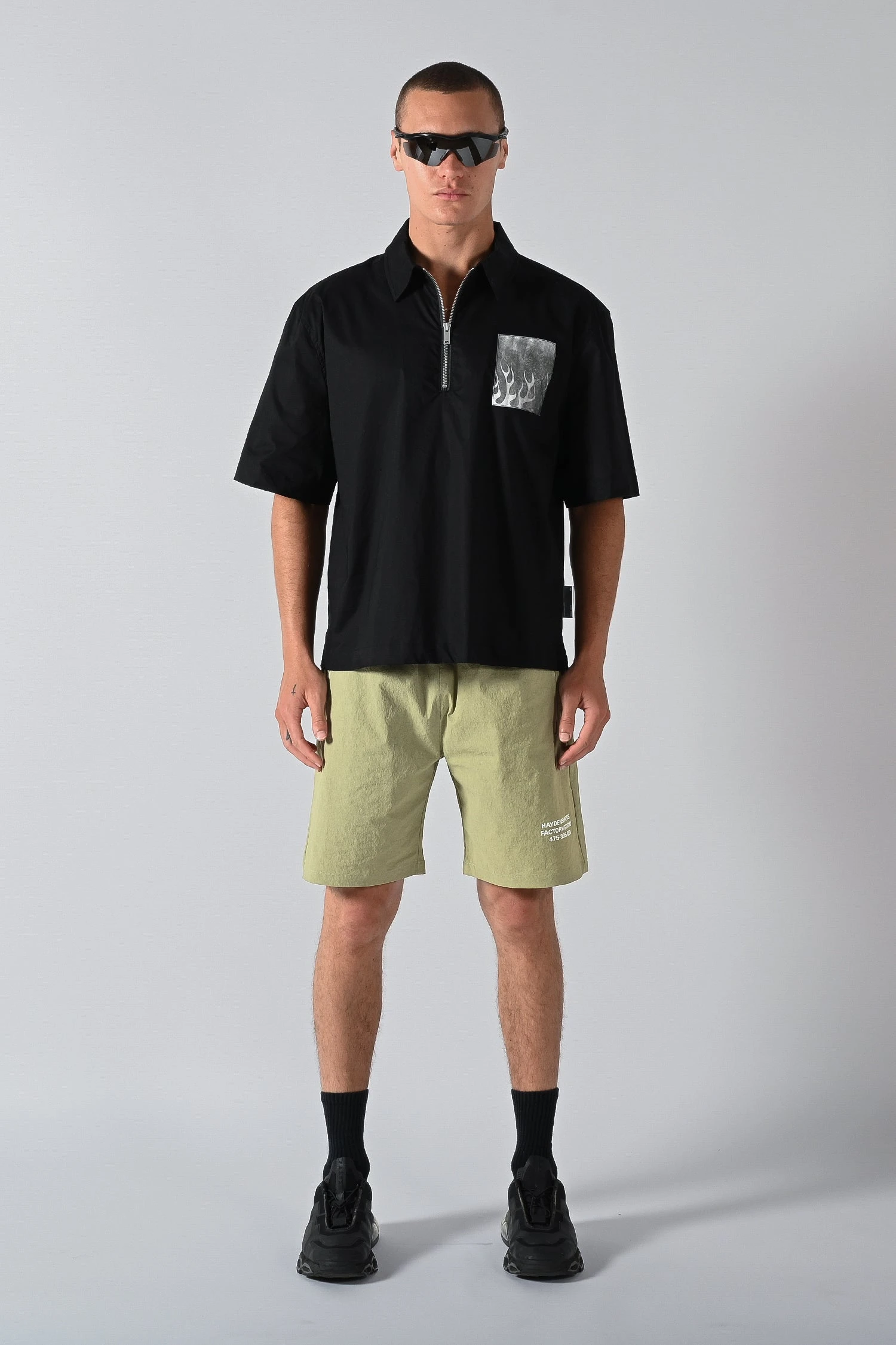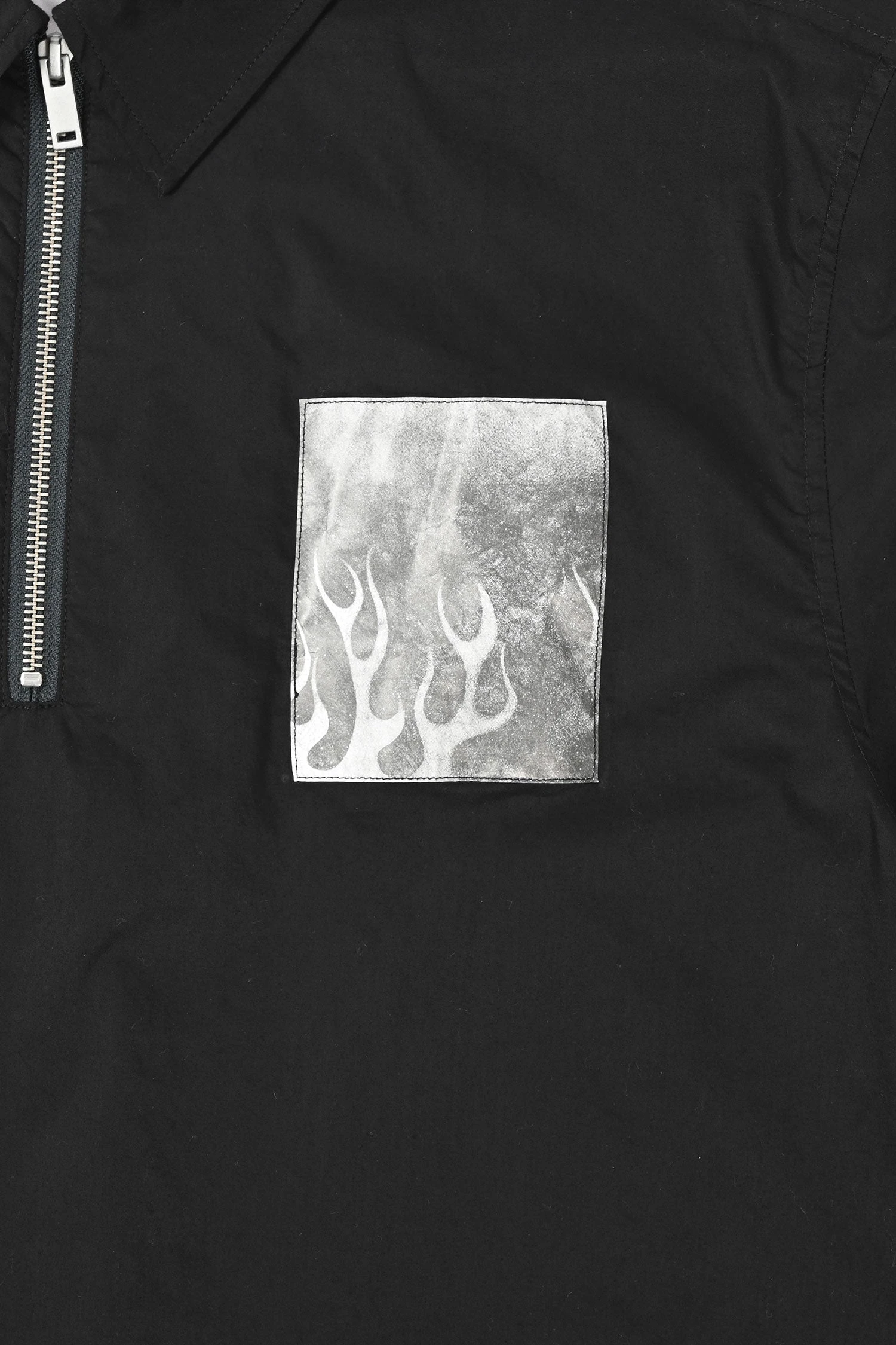 Relaxed boxy fit short sleeve shirt made from high density cotton poplin fabric with a quarter zip neck closure, dropped shoulder cut and tyvec flame print graphic on the chest.Â