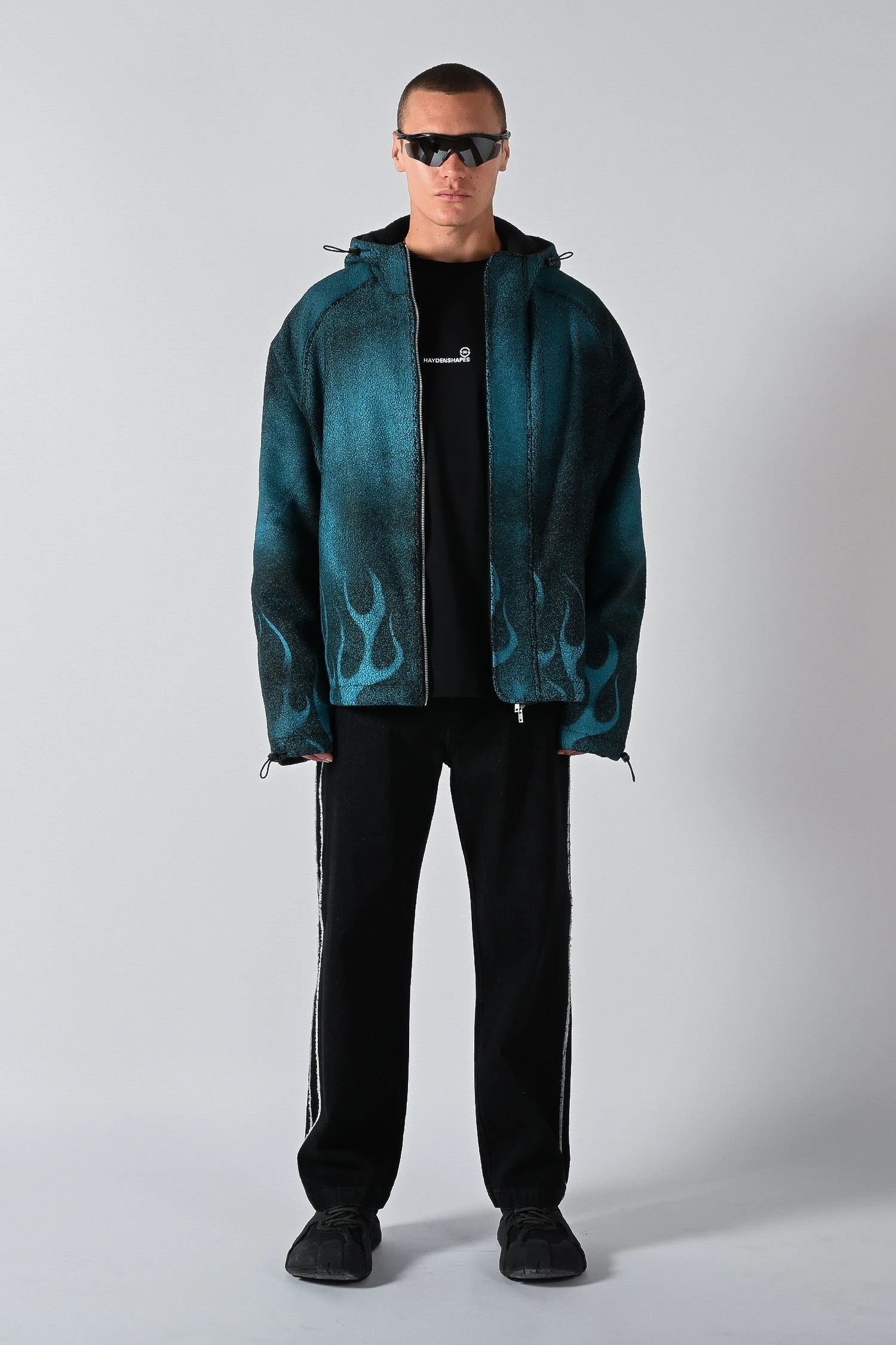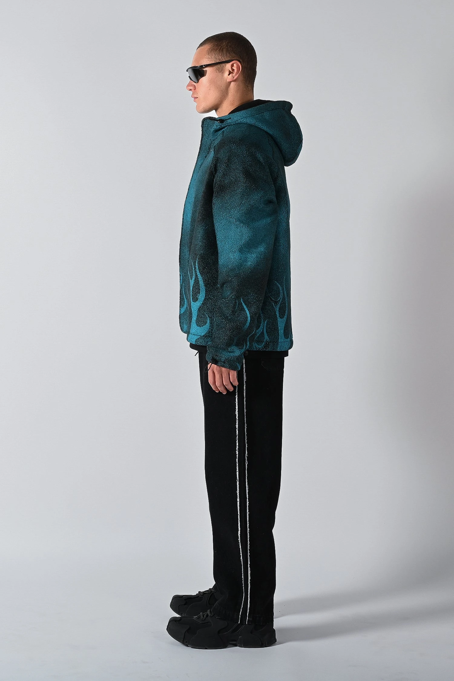 Made from recycled fleece fabric with a bold flame graphic print. The Traction Hooded Fleece Jacket features front mid zip pockets, an oversized hood, front zip entry and size adjustable waistband and sleeves.Â